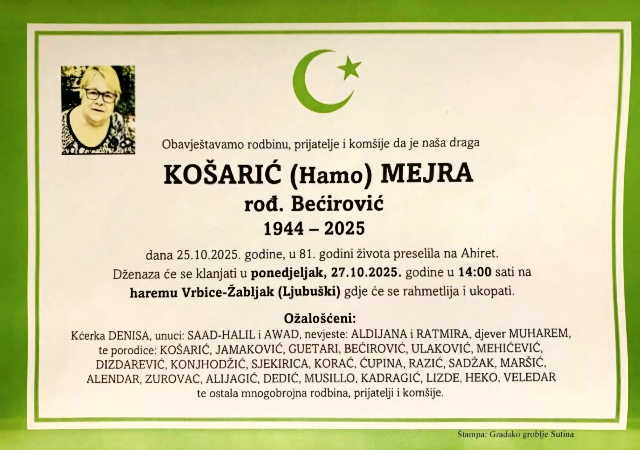 Vijesti Na Ahiret preselila Košarić (Hamo) Mejra rođ. Bećirović October 26, 2025 FacebookTwitterPinterestWhatsApp Dženaza namaz će se obaviti u ponedjeljak 27. oktobra 2025. godine u 14:00 sati, u mezarju Vrbice – Žabljak. Molimo Allaha dž.š. da se smiluje našoj Mejri, a porodici podari sabur.
